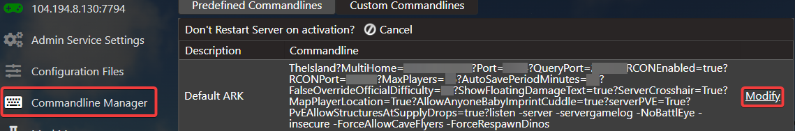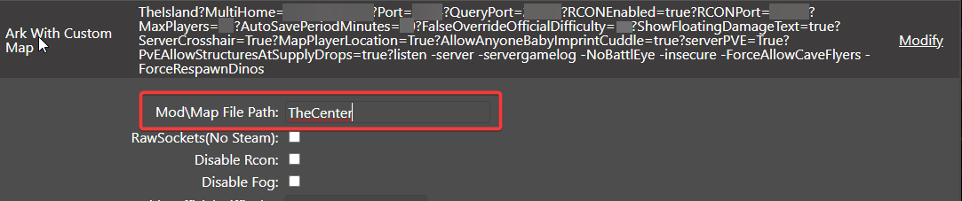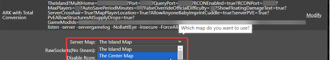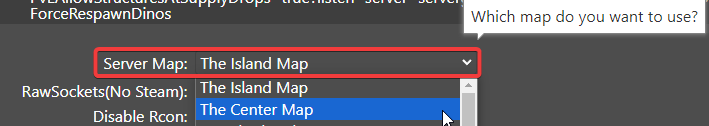 Once the "Default ARK" command line has been selected, you'll want to change "Server Map" to "The Center Map".
