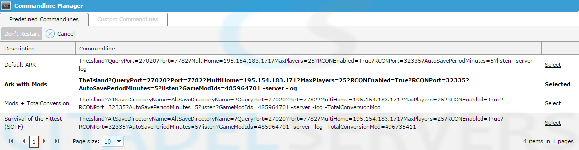 Select the commandline ark with mods, of if your using a total conversion too, select the total conversion commandline.