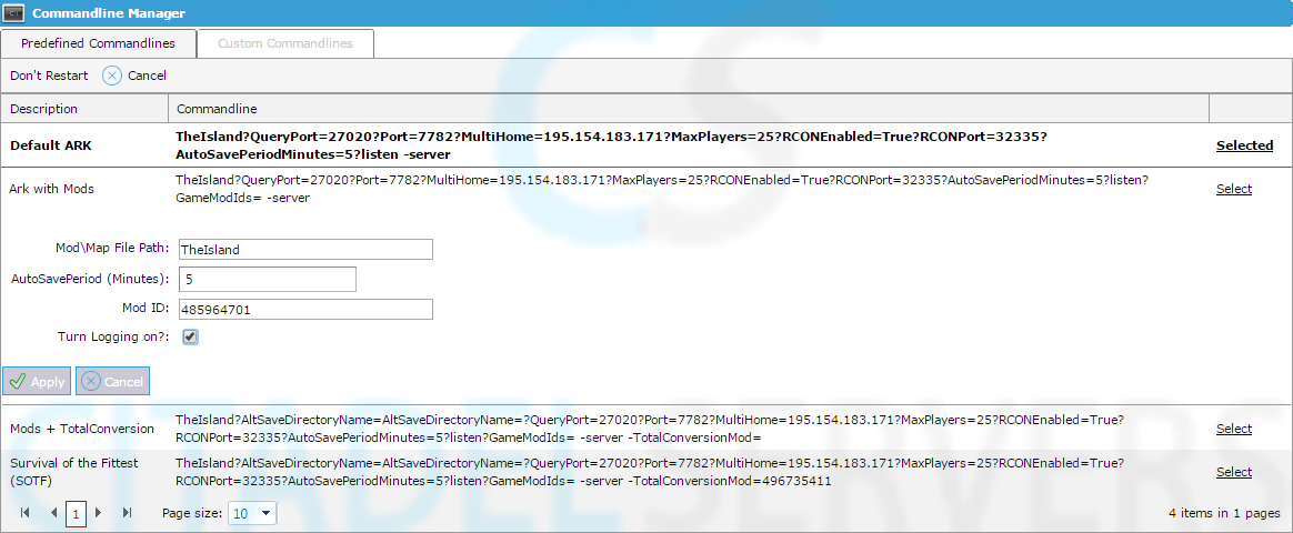 TheIsland?QueryPort=port?Port=port?MultiHome=ipaddress?MaxPlayers=playerslots?RCONEnabled=True?RCONPort=port?AutoSavePeriodMinutes=5?listen? GameModIds=485964701 -server