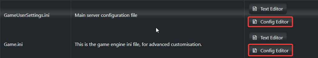 To access general settings, click Game.ini or GameUserSettings.ini and select the "Configuration Editor" view.